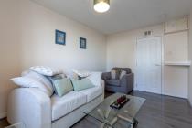 Large furnished 1-bed flat on Bonnyview Drive with carpeted lounge, electric fireplace, dining kitchen, excellent storage, free parking, and Council Tax A.